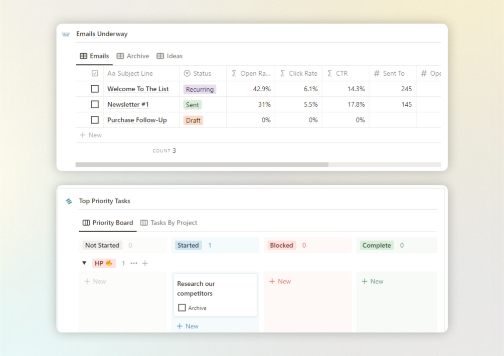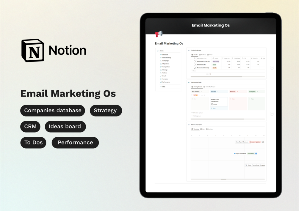 Introducing the Email Marketing Notion Template: Your go-to resource for marketers to unleash their creativity, streamline campaigns, and conquer the world of email marketing. This comprehensive template empowers marketers to organize their ideas, plan campaigns, and track performance on one intuitive platform. Elevate your email marketing game and watch your campaigns soar to new heights. Let's transform your vision into impactful results! 📧🚀