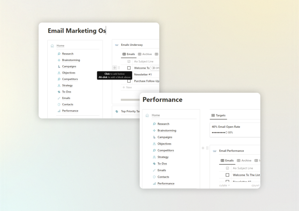 Introducing the Email Marketing Notion Template: Your go-to resource for marketers to unleash their creativity, streamline campaigns, and conquer the world of email marketing. This comprehensive template empowers marketers to organize their ideas, plan campaigns, and track performance on one intuitive platform. Elevate your email marketing game and watch your campaigns soar to new heights. Let's transform your vision into impactful results! 📧🚀