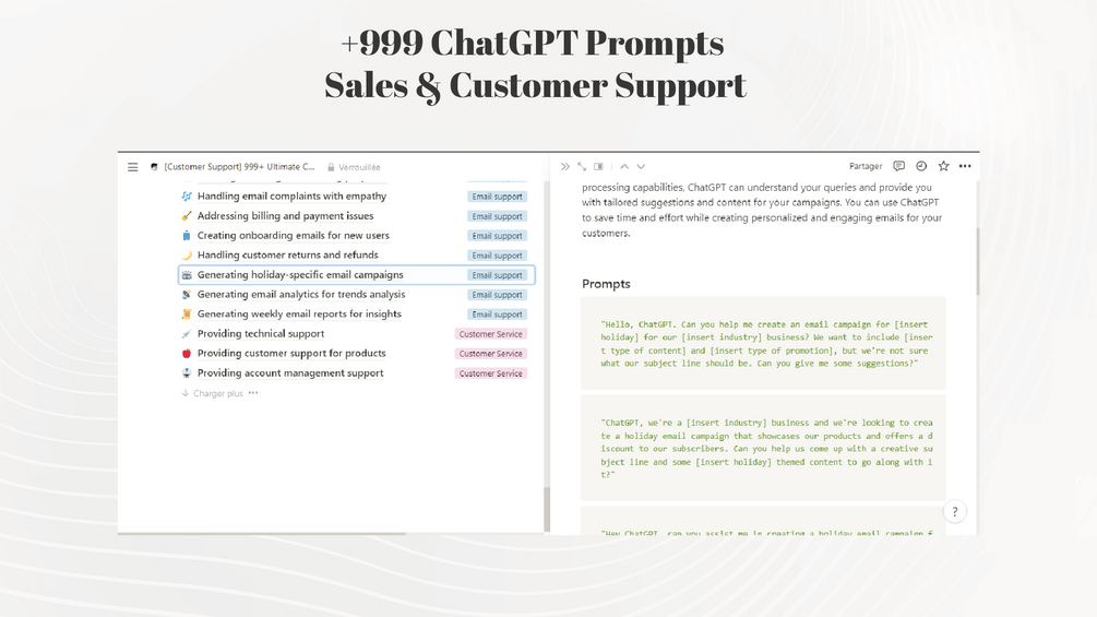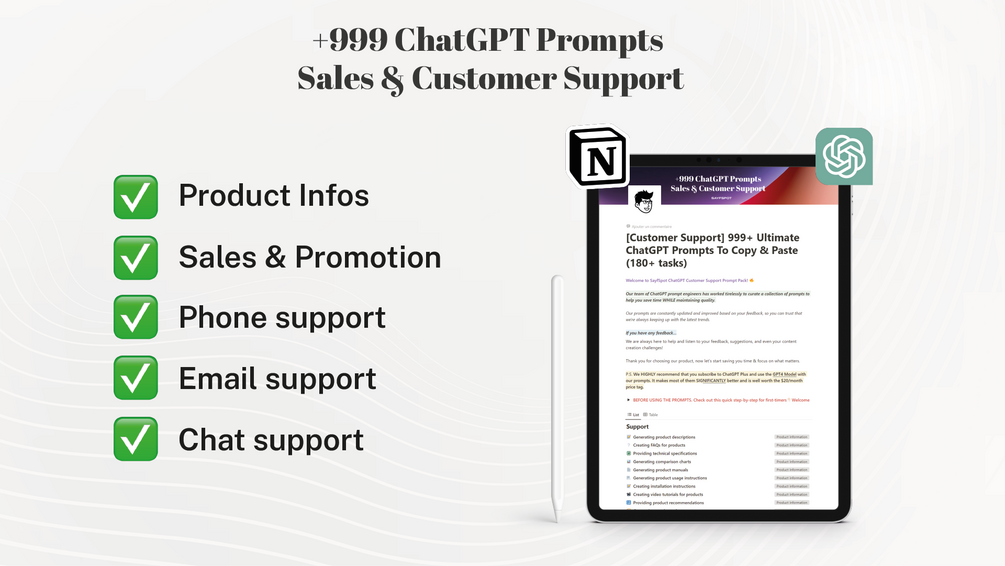 Introducing the ultimate solution for sales and customer support professionals - a Notion page containing over +999 prompts to help you succeed in the world of e-commerce & sales